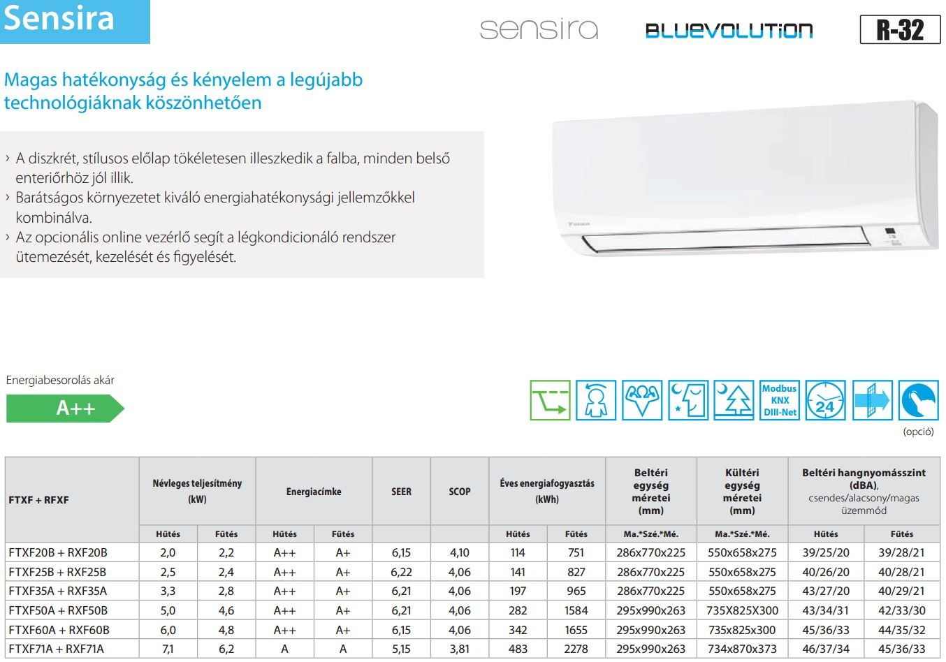 A Daikin FTXF50F / RXF50D Sensira Inverteres Split klíma fontos tulajdonságai: